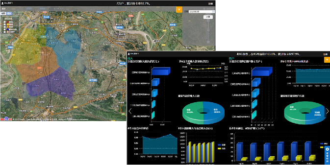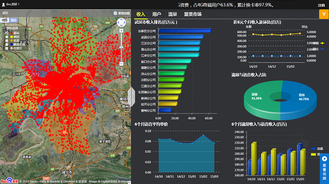 實(shí)時(shí)集中監(jiān)控平臺(tái)以簡(jiǎn)潔、美觀的圖表頁(yè)面,集中展現(xiàn)企業(yè)各環(huán)節(jié)經(jīng)營(yíng)數(shù)據(jù)。武漢移動(dòng)經(jīng)過多年信息化的建設(shè),已形成區(qū)域化的業(yè)務(wù)管理體系,并積累了大量的業(yè)務(wù)數(shù)據(jù)。為清晰呈現(xiàn)各項(xiàng)指標(biāo)在全市范圍內(nèi)不同區(qū)域的整體情況,億信BI通過在GIS地圖上對(duì)各區(qū)域模塊進(jìn)行顏色渲染,清晰展示企業(yè)業(yè)務(wù)區(qū)域的分布情況(如下圖左側(cè)所示),同時(shí)通過多TAB頁(yè)的展示方式(如下圖右側(cè)所示),以專題化(包括收入,用戶發(fā)展、4G發(fā)展等專題)的頁(yè)面,分析了各主題中不同項(xiàng)經(jīng)營(yíng)指標(biāo)的排名,占比,趨勢(shì)以及對(duì)比情況,從而使決策者可快速定位自己所關(guān)心的重點(diǎn)數(shù)據(jù)。