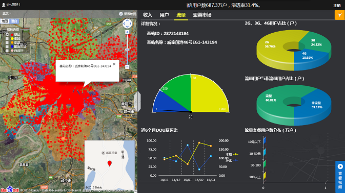 武漢移動(dòng)基于已有的大量基站,集團(tuán)客戶,營(yíng)業(yè)廳等各項(xiàng)指標(biāo)的地理信息,結(jié)合億信BI的GIS應(yīng)用,實(shí)現(xiàn)了地圖上40000多個(gè)基站數(shù)據(jù)點(diǎn)的標(biāo)注。平臺(tái)利用億信BI,將基站、營(yíng)業(yè)廳已有的GPS坐標(biāo)換算成百度坐標(biāo),使其可以在百度GIS上進(jìn)行精準(zhǔn)的標(biāo)注。再在平臺(tái)頁(yè)面中,通過百度GIS地圖上的數(shù)據(jù)點(diǎn)的標(biāo)注,以直觀的密集度呈現(xiàn)出武漢市區(qū)域范圍內(nèi)基站以及營(yíng)業(yè)廳等指標(biāo)的分布情況,輔助領(lǐng)導(dǎo)進(jìn)行決策。