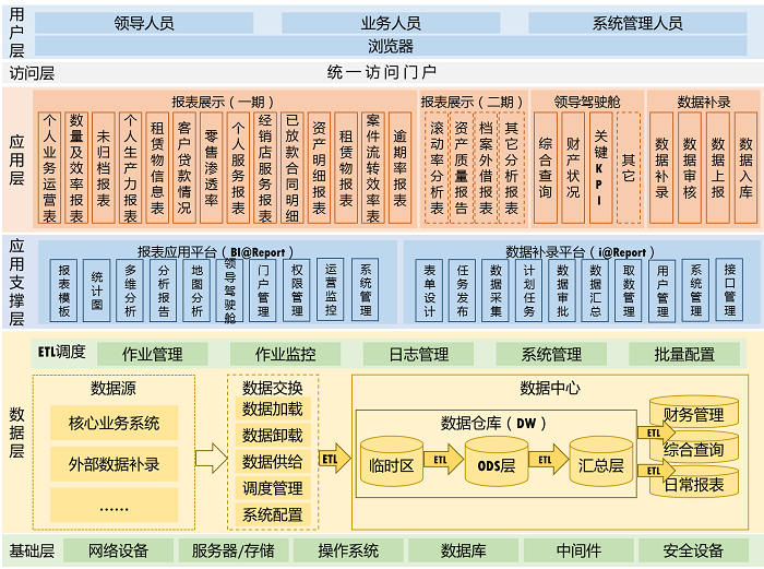 基于對業務數據的匯總、加工等數據模型設計,在成熟的數據采集產品和數據補錄軟件平臺的基礎上構建了數據展現分析模塊、數據補錄報送模塊 、用戶權限管理模塊以及門戶配置模塊 。