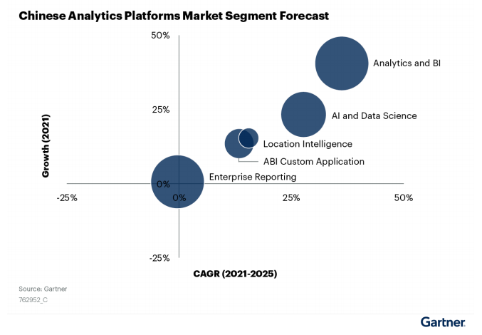 在《指南》中,Gartner對(duì)數(shù)據(jù)分析平臺(tái)的能力做了進(jìn)一步的定義,包括了:企業(yè)報(bào)告平臺(tái)、ABI平臺(tái)、AI和數(shù)據(jù)科學(xué)平臺(tái)、ABI定制化應(yīng)用和位置智能平臺(tái)等方向。而在這些細(xì)分市場(chǎng)中,增長(zhǎng)最快的領(lǐng)域是ABI平臺(tái)、AI和數(shù)據(jù)科學(xué)平臺(tái),預(yù)計(jì)復(fù)合年增長(zhǎng)率分別為36.23%和27.72%。