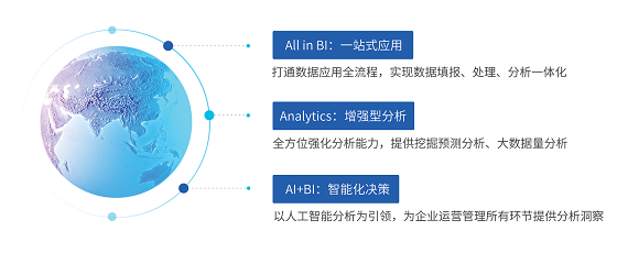 AII in BI:一站式應(yīng)用型BI。產(chǎn)品功能全面,打通數(shù)據(jù)應(yīng)用全流程,實(shí)現(xiàn)數(shù)據(jù)填報(bào)、處理、分析一體化。一個(gè)產(chǎn)品平臺(tái)即可為政企用戶提供從數(shù)據(jù)準(zhǔn)備,ETL數(shù)據(jù)處理、數(shù)據(jù)建模、數(shù)據(jù)可視化、數(shù)據(jù)分析、數(shù)據(jù)填報(bào)、移動(dòng)應(yīng)用等一系列功能。