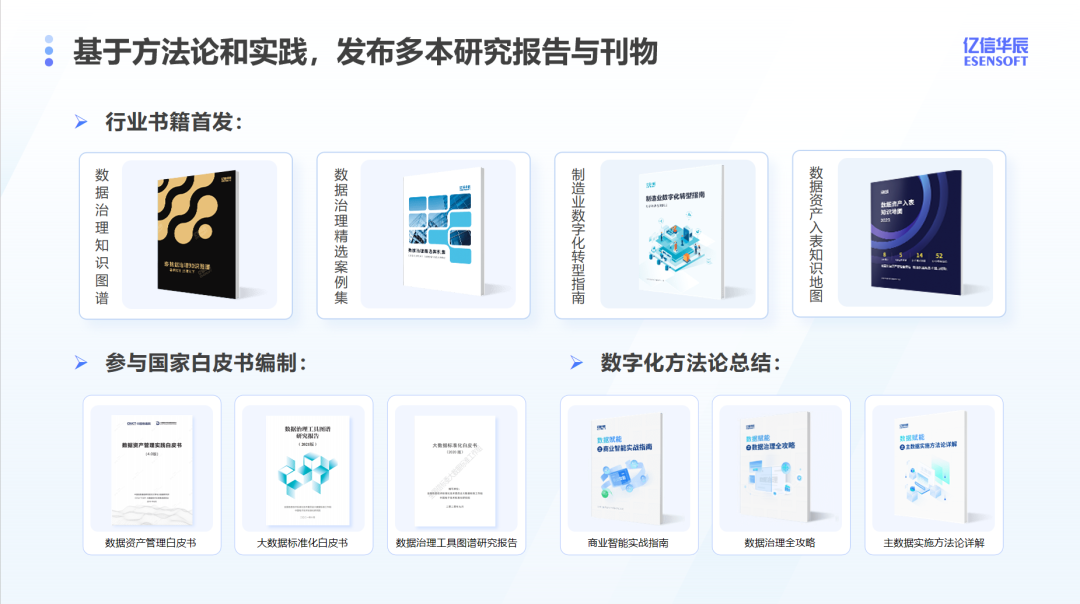億信華辰積極推進產學研深度融合,加入中國信息通信研究院、大數據技術標準推進委員會、全國信標委大數據標準工作組等國家行業性組織,參與國家各類標準及行業白皮書的編制和討論,基于方法論和實踐,行業獨家首發《數據治理知識圖譜》、《數據治理精選案例集》、《數據資產入表知識地圖》等知識性書籍,助推大數據及數據治理行業發展。
