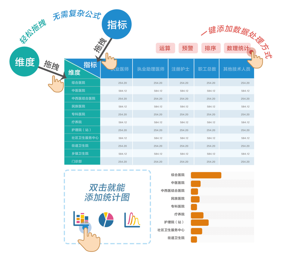 完全面向業務人員,充分理解當下業務人員渴求自主探索數據的心情,只需要簡單的鼠標拖拽維度和指標,即可快速生成圖表。點選式數據預處理,智能的圖表推薦,全程無需編寫表達式,零學習成本,一分鐘上手。敏捷看板中不僅內置多種數據統計函數,如:求和,最大值,排名,同比、環比、上期等,而且支持自定義維度和指標,兩者可以一鍵切換,靈活簡便的分析方式,方便用戶進行猜想式、求證式的數據探索。