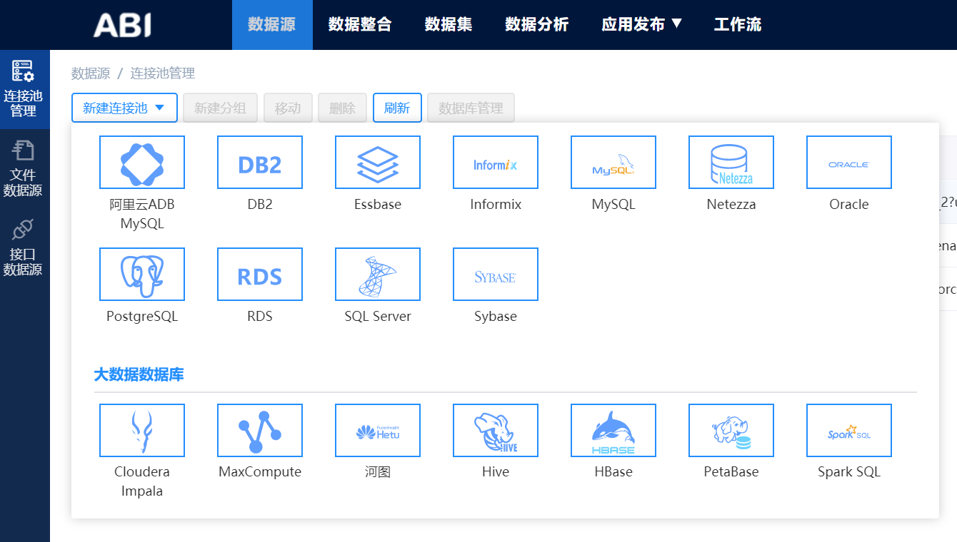 第一步,就是對(duì)接數(shù)據(jù)庫(kù),億信ABI支持對(duì)接包括:Mysql、Oracle、SQL Server、DB2、GBase、PetaBase、Essbase等多種數(shù)據(jù)庫(kù),而且還支持各種其他類(lèi)型文件的導(dǎo)入數(shù)據(jù),包括excel、txt、csv、db等等文件。