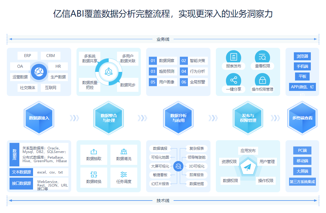 作為一款全能型數據分析工具,億信ABI不僅支持連接類似oracle、mysql之類的數據庫,還支持類似文件數據或者網絡接口數據,數據來源支持廣泛;億信ABI的分析方式也很豐富,可以滿足市場上的各種場景需求,不論是中國式復雜報表,還是類似天貓雙十一作戰大屏的交互式炫酷效果,它都能實現;億信ABI系統的擴展性和穩定性都很OK,對于大數據量的數據分析,實現系統的線性擴展的同時保證良好的系統穩定性;大數據時代,對數據處理的能力要求也變的更高,億信ABI就實現了千萬、千億甚至更大數據量數據的秒級響應。