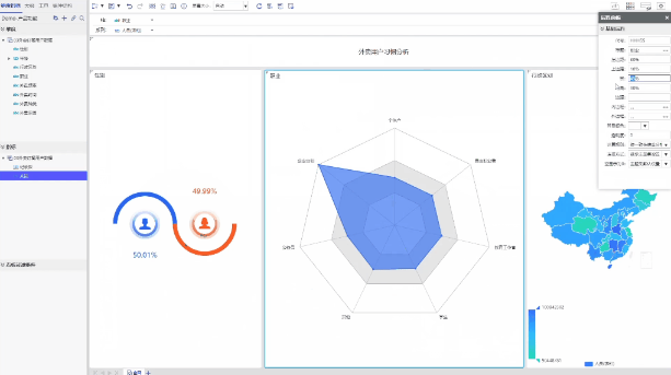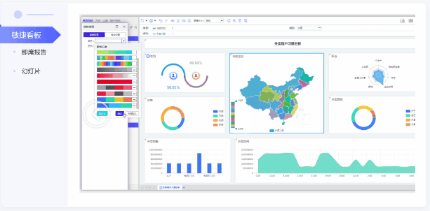 支持敏捷看板,即席報告,幻燈片等多種分析方式,使數據分析更貼近用戶應用的場景。并且提供多種可視化組件:表格、常規統計圖、html5統計圖、地圖等。