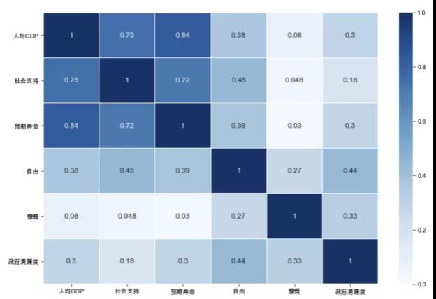 上述的結果表明,經濟可能對預期壽命和社會支持都有很強的影響,自由在一定程度上會影響其他因素,而捐款和政府的清廉程度與其他因素的關系并不明顯。