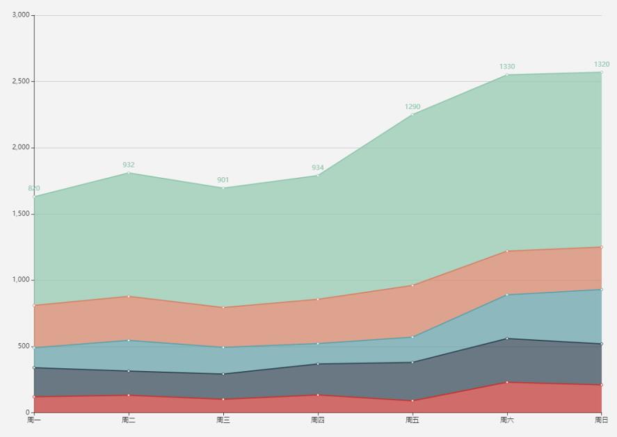 常規(guī)面積圖適合表現(xiàn)總量和分量之間的關(guān)系,比如總量是總用戶量,而分量是各個渠道的用戶,那么選用面積圖較為合適