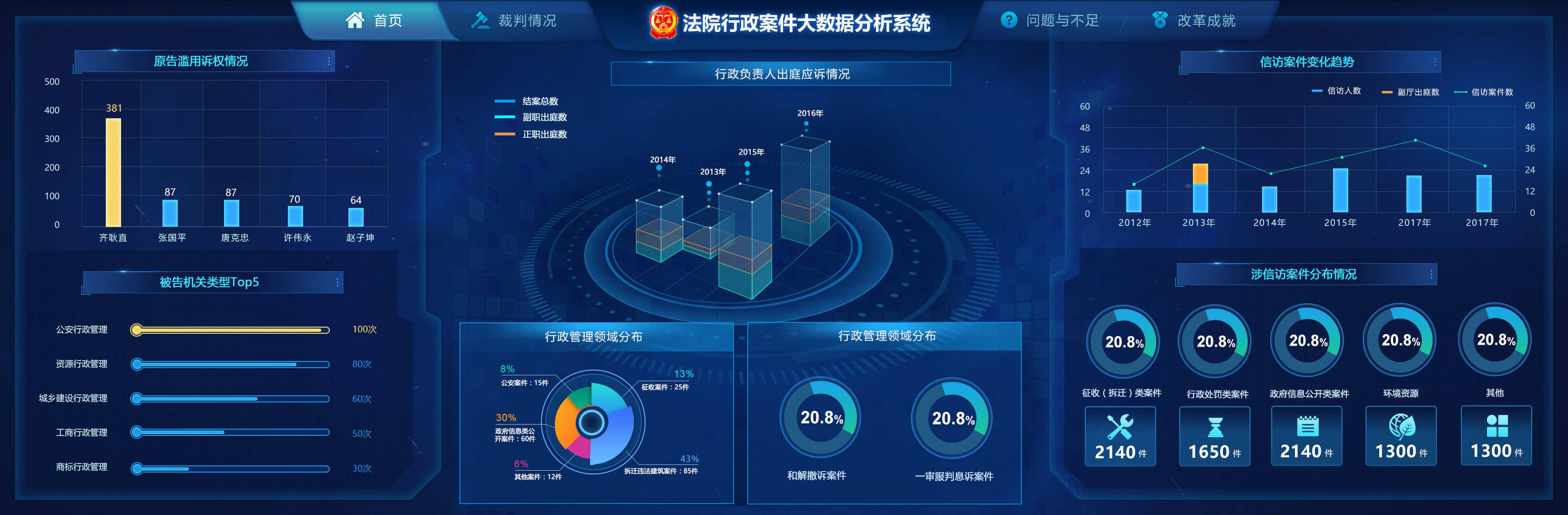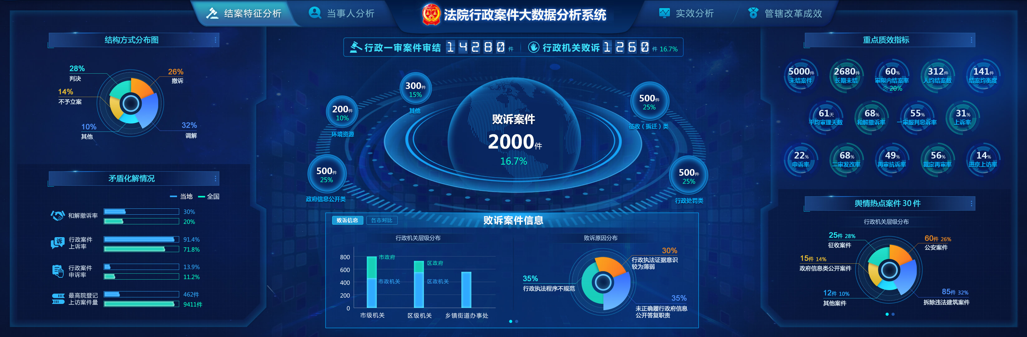 法院行政案件大數(shù)據(jù)分析系統(tǒng)包含了結(jié)案特征分析、當事人分析、實效分析和管轄改革成效。通過收案/結(jié)案的數(shù)量和增幅,分別用時間、領域、地區(qū)等維度分析案件變化趨勢,從結(jié)構(gòu)方式、矛盾化解情況、重點質(zhì)效指標、輿情熱點案件、敗訴案件和敗訴案件信息來分析結(jié)案特征,用信訪案件變化趨勢和分布情況針對機關濫用職權(quán)情況來特別分析。不同分析角度分析不同數(shù)據(jù),實現(xiàn)案件大數(shù)據(jù)全方位解讀。