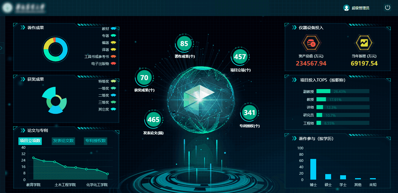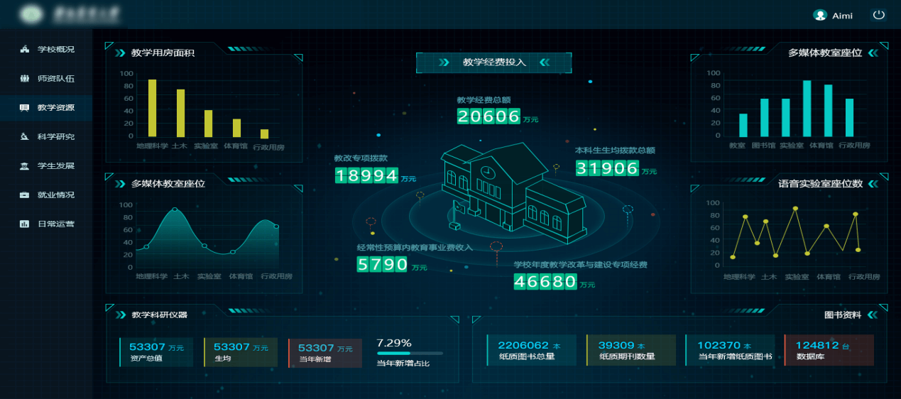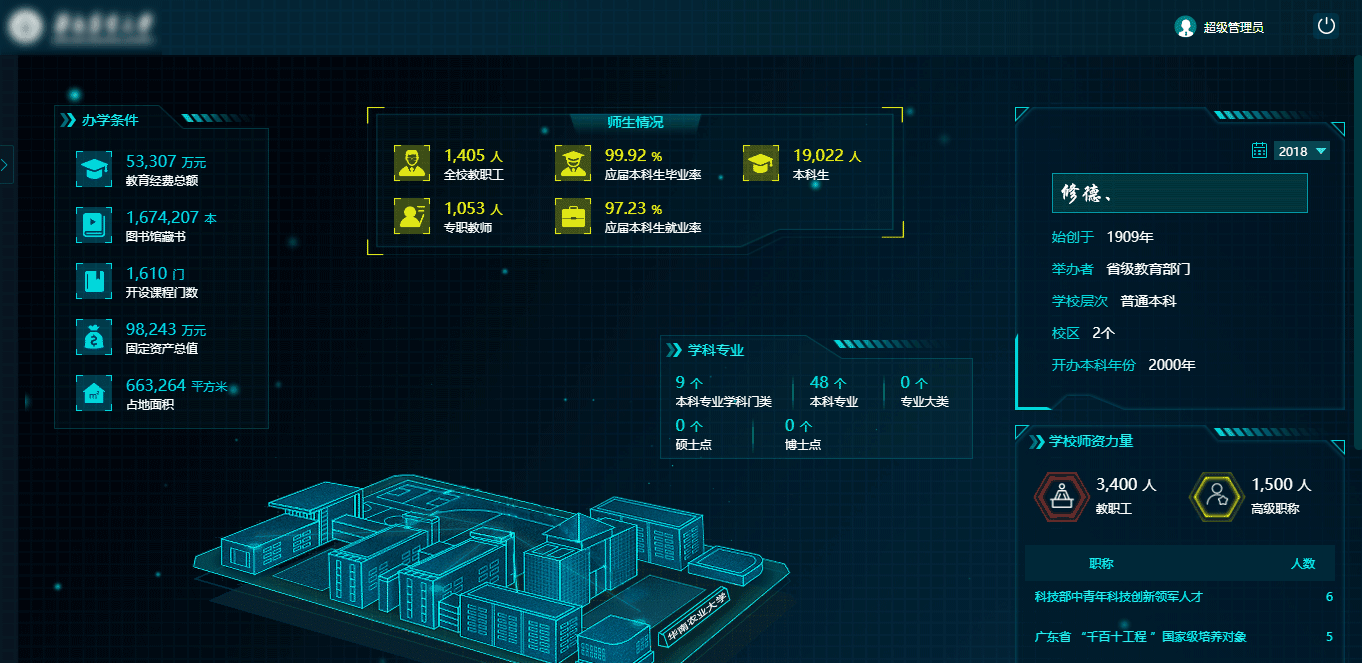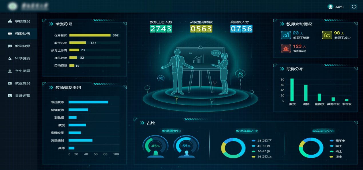 為了展現(xiàn)學校的實力,分別從學校概況、師資隊伍、教學資源、科學研究、學生發(fā)展、就業(yè)情況和日常運營的角度來展示。學校概況包括辦學條件、師生情況、學科專業(yè)和師資力量,再通過榮譽稱號、教師編制類別、教職工人數(shù)、研究生導師數(shù)、高層次人才、職稱分布、最高學位分布等展示師資隊伍,用教學用房面積、教學經(jīng)費投入、教學科研儀器、圖書資料等來表現(xiàn)教學資源,用著作成果、獲獎成果、論文與專利等展現(xiàn)科學研究。