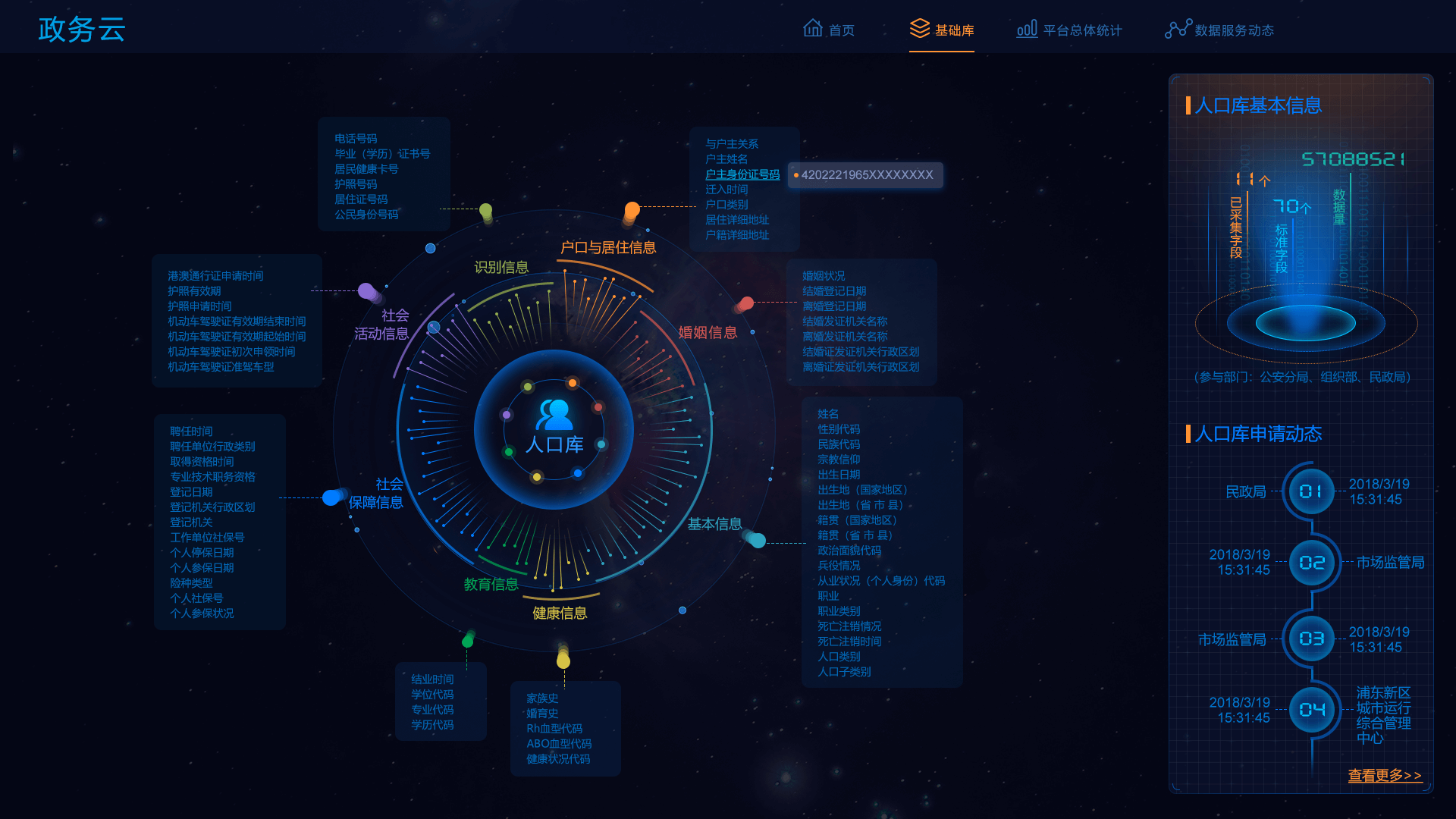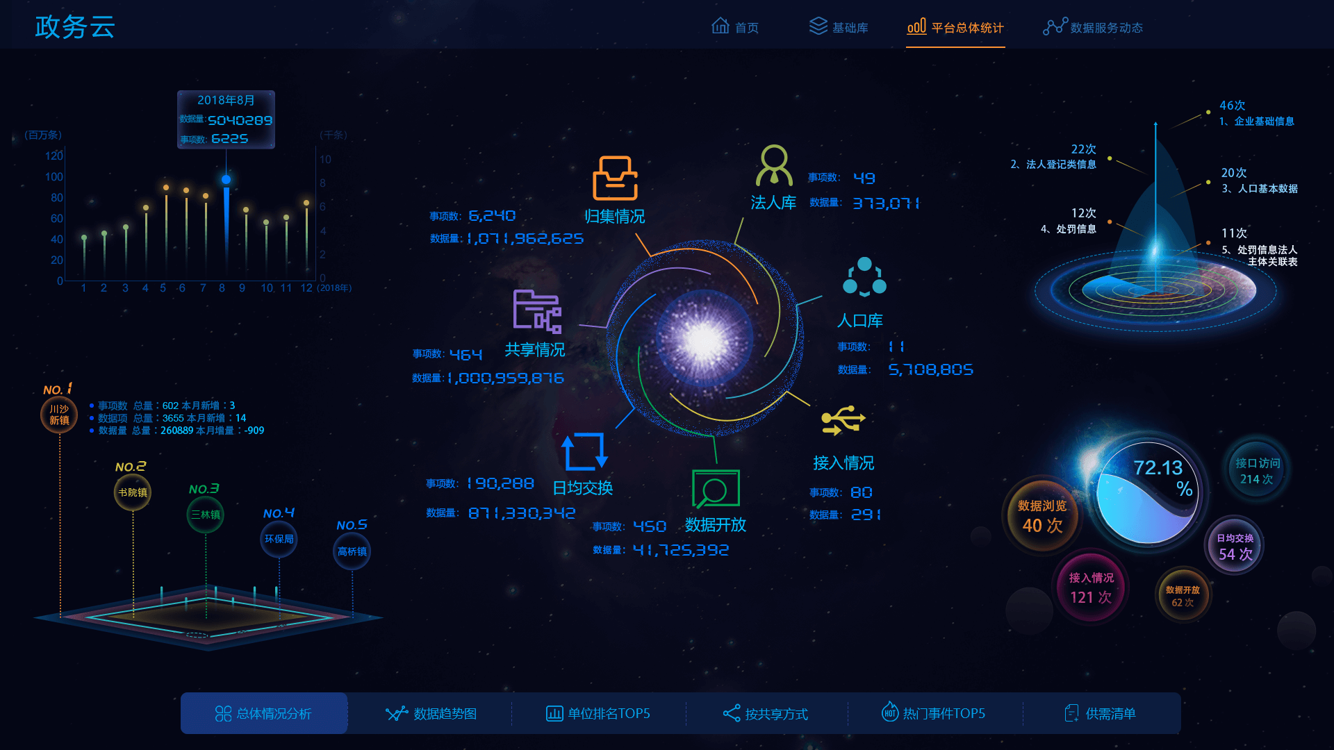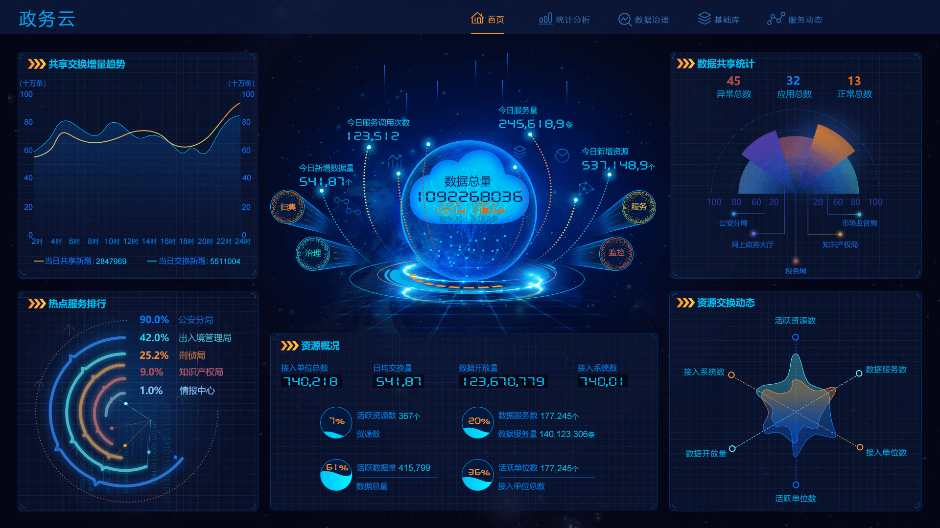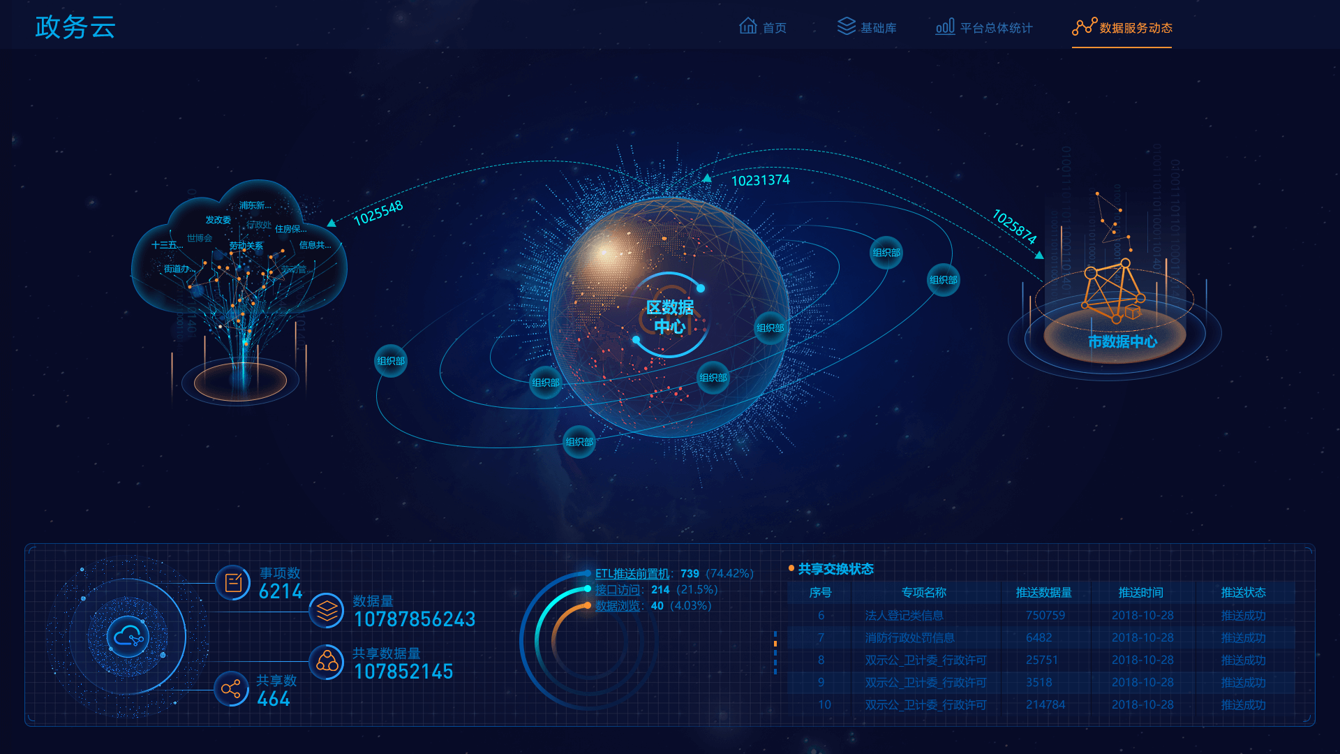 首頁展示共享方式占比、共享屬性占比、數(shù)據(jù)趨勢、熱門事項、和單位排名等,基礎庫包括人口庫、法人庫,支持搜索刷新,同時展示庫的基本信息和申請動態(tài),平臺總體統(tǒng)計展示平臺各類指標數(shù)據(jù)的訪問、更新情況,數(shù)據(jù)服務動態(tài)展現(xiàn)區(qū)數(shù)據(jù)中心和市數(shù)據(jù)中心等的數(shù)據(jù)實時交互狀況,實現(xiàn)數(shù)據(jù)全方位全時段把控。